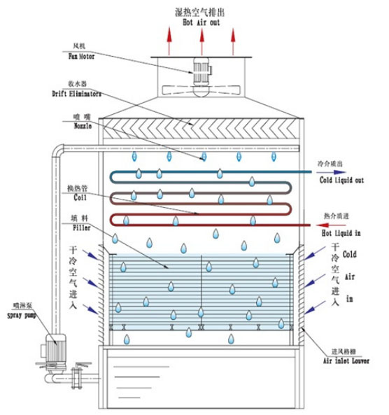 闭式冷却塔与传统敞开式冷却塔相比实现了冷却水(纯净水)的全封闭内路循环,不需要挖水池,移址方便。在水资源缺乏的地区尤其适用。